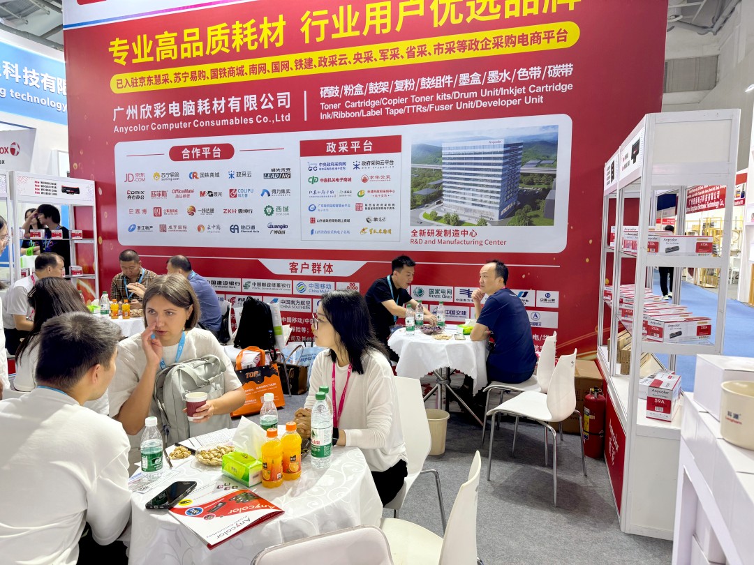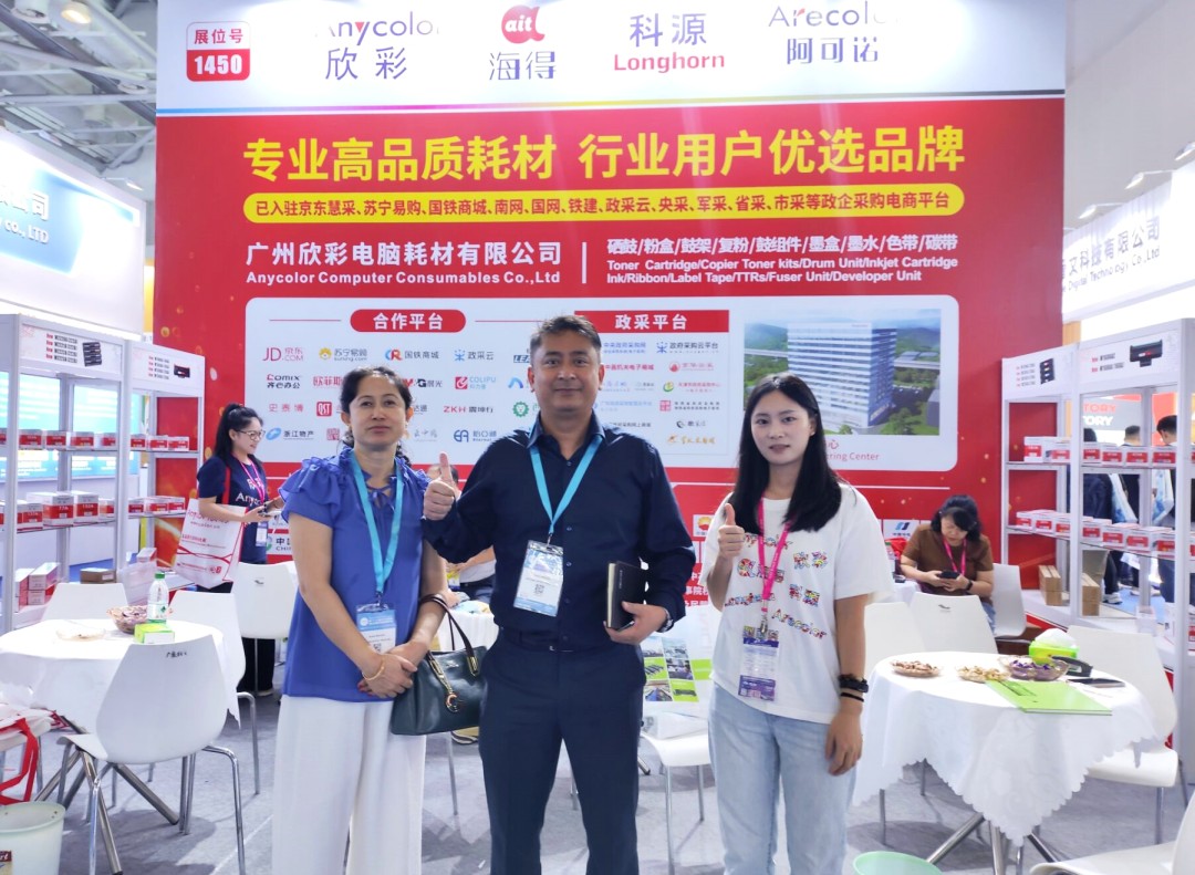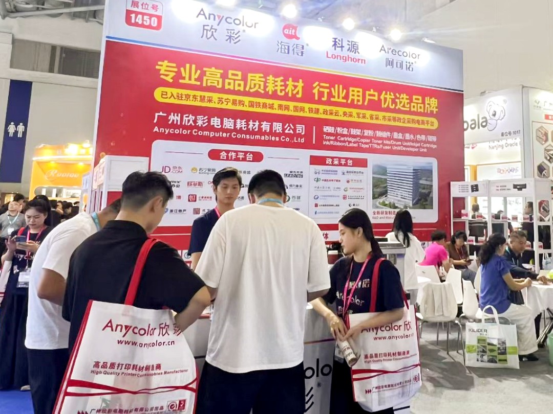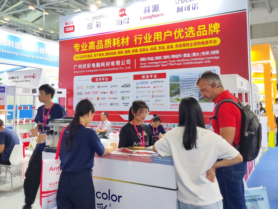 Anycolor Computer Consumables Co., Ltd. is a "specialized, refined, innovative" and "high-tech" enterprise that integrates manufacturing, research and development, and sales of printer and copier consumables. We have been deeply involved in the printer and copier consumables industry for nearly 20 years, with sales channels in all provinces and cities in China. Our products are exported to more than 120 countries and regions overseas. With a good brand reputation and excellent product quality, the exhibition site has attracted numerous purchasers and professional buyers from different countries and skin colors around the world to exchange and negotiate cooperation.